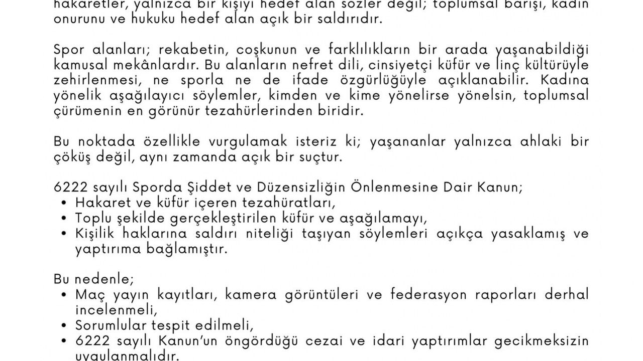 "Bu saldırı yalnızca bir kişiyi hedef alan sözler değil; toplumsal barışı, kadın onurunu ve hukuku hedef alan açık bir saldırıdır. Spor alanlarının nefret dili ve linç kültürüyle zehirlenmesi, ne sporla ne de ifade özgürlüğüyle açıklanabilir."