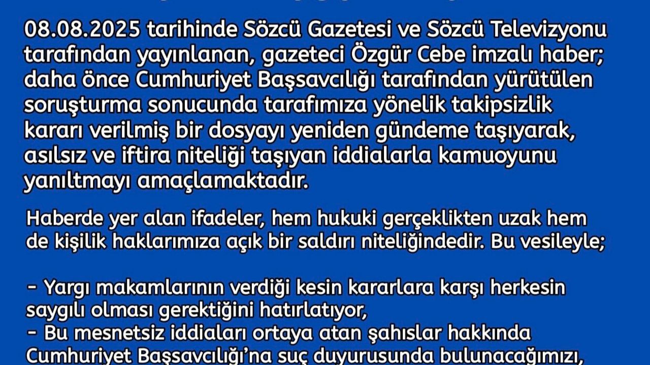 08.08.2025 tarihinde Sözcü Gazetesi ve Sözcü Televizyonu’nda yayımlanan haberlerde, daha önce savcılık makamınca yürütülen ve herhangi bir suç unsuru bulunmadığı için takipsizlik kararı verilen bir dosya yeniden gündeme getirilmiştir.