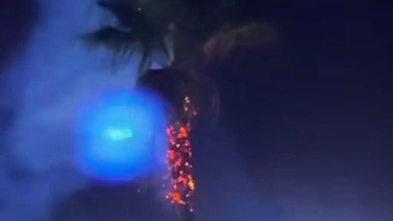 Cizre Belediyesi’nin önünde bir düğün sırasında havaya atılan havai fişekler nedeniyle palmiye ağacı alev aldı.