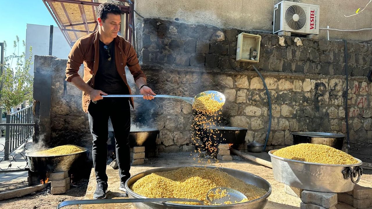 Hz. Nuh Camii avlusunda yapılan etkinlikte, sabahın erken saatlerinde başlayan hazırlıklarda mahalle sakinleri ve gönüllüler kazanlarda buğdayı geleneksel usulle kaynatıyor.