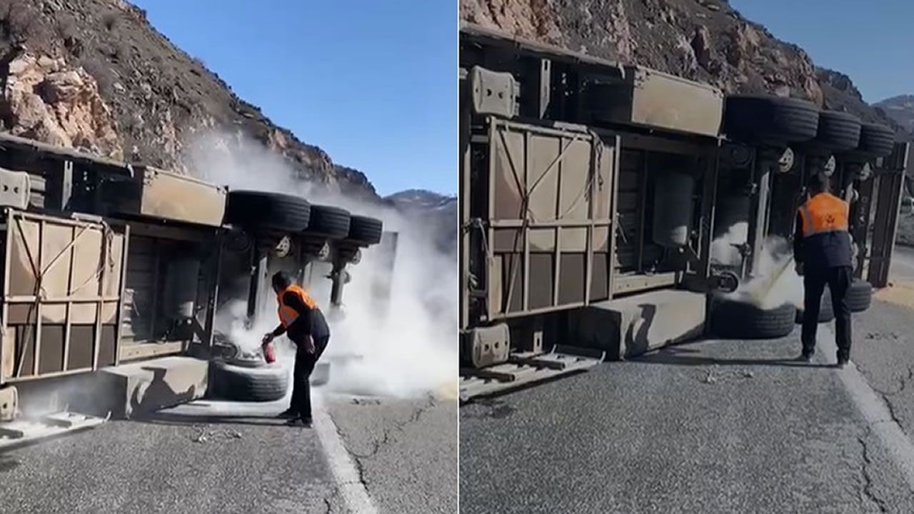 Hakkari istikametine ilerleyen, plakası ve sürücüsü henüz öğrenilemeyen tırın devrilmesinin ardından araçta yangın riski oluştu. Sürücü kazadan yara almadan kurtulurken, olay yerine gelen karayolları ekipleri alev alan araca yangın söndürme tüpüyle hızlı şekilde müdahale etti. Ekiplerin zamanında müdahalesi sayesinde tırın tamamen yanması önlenirken, bölgede kısa süreli panik yaşandı. Kazayla ilgili inceleme başlatıldı.