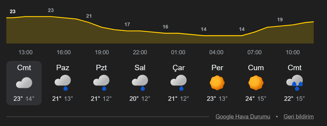 Meteoroloji verilerine göre ilçede sıcaklıkların 20 ila 24 derece bandında seyretmesi bekleniyor. Yetkililer, yağışlı günlerde vatandaşların dikkatli olmasını istedi.