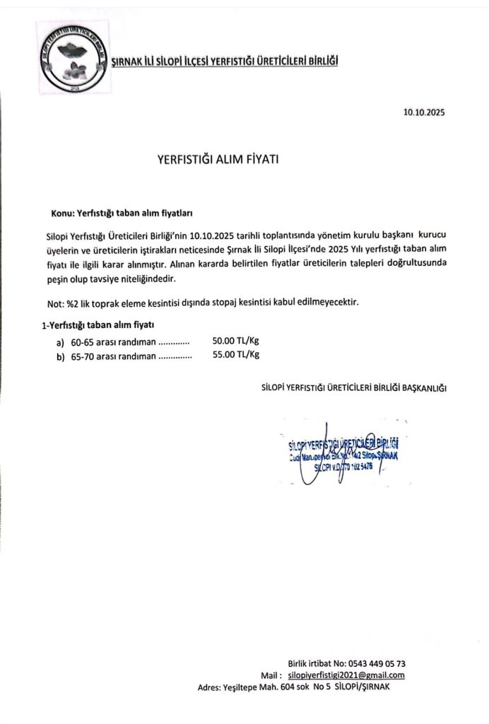 Silopi Yerfıstığı Üreticileri Birliği, Silopi Ziraat Odası Başkanlığı ve üreticilerin katılımıyla gerçekleştirilen toplantıda, 2025 yılı yerfıstığı taban alım fiyatı belirlendi. Yeni fiyatlara göre randıman oranına göre kilogramı 50 ila 55 TL arasında değişen taban fiyatlar açıklandı.