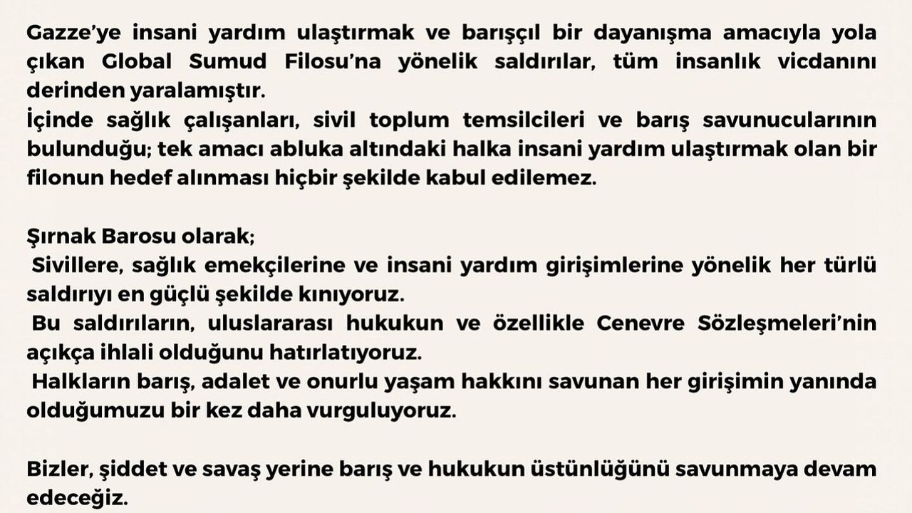 Şırnak Barosundan yapılan açıklama şu şekilde; "Gazze'ye insani yardım ulaştırmak ve barışçıl bir dayanışma amacıyla yola çıkan Global Sumud Filosu'na yönelik saldırılar, tüm insanlık vicdanını derinden yaralamıştır.