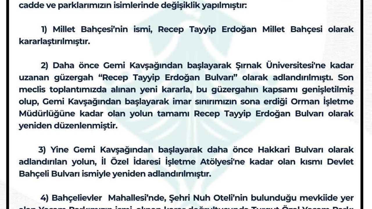 Şırnak Belediyesi, Başkan Mehmet Yarka toplanılan Temmuz ayı meclis toplantısında aldığı kararla kent genelinde bazı cadde ve parkların isimlerini değiştirdi. Alınan karar doğrultusunda, Cumhurbaşkanı Recep Tayyip Erdoğan ve MHP Genel Başkanı Devlet Bahçeli’nin isimleri kentteki önemli güzergâhlara verildi.