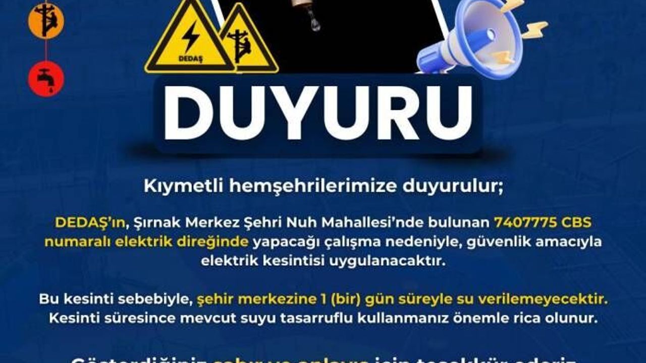 Belediye’den yapılan açıklamada; “DEDAŞ’ın, Şırnak Merkez Şehri Nuh Mahallesi’nde bulunan 7407775 CBS numaralı elektrik direğinde yapacağı çalışma nedeniyle, güvenlik amacıyla elektrik kesintisi uygulanacaktır. Bu kesinti sebebiyle, şehir merkezine 1 (bir) gün süreyle su verilemeyecektir. Kesinti süresince mevcut suyu tasarruflu kullanmanız önemle rica olunur. Gösterdiğiniz sabır ve anlayış için teşekkür ederiz” denildi.