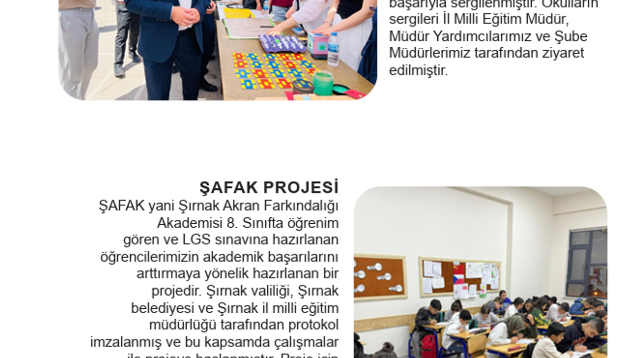 Şırnak’tan Dikkat Çeken Eğitim Projeleri Bültende yer alan illerden biri olan Şırnak, hayata geçirdiği projelerle hem akademik başarıyı hem de sosyal gelişimi destekleyen çalışmalarıyla öne çıktı. İl Milli Eğitim Müdürlüğü’nün yürüttüğü projeler şöyle: Her Okur Bir Lider Projesi Öğrencilerin okuma alışkanlıklarını artırmak amacıyla başlatılan bu proje kapsamında, Şırnak’taki okullarda düzenli olarak okuma saatleri gerçekleştirildi. Projenin temel amacı, öğrencilerin okuduğunu anlama becerilerini geliştirmek ve bu yolla akademik başarılarını desteklemek. Okulumla Sosyalleşiyorum Projesi Öğrencilerin sosyal, kültürel ve sanatsal etkinliklere aktif katılımını teşvik etmeyi amaçlayan bu proje ile her öğrencinin bir eğitim-öğretim yılı boyunca en az bir sosyal faaliyete katılması sağlandı. Özellikle dezavantajlı bölgelerdeki öğrenciler için sinema günleri ve hamburger etkinlikleri düzenlendi, merkeze ulaşım destekleri sunuldu. TÜBİTAK 4006-A ve 4006-B Bilim Fuarları Bilimsel düşünceyi teşvik eden projeler kapsamında 18 okul, TÜBİTAK 4006-A ve 4006-B destek programlarına kabul edildi. Projeler başarıyla sergilenirken, fuar alanlarını İl Milli Eğitim Müdürü ve yöneticiler ziyaret ederek öğrencilere destek verdi. ŞAFAK Projesi – Şırnak Akran Farkındalığı AkademisiLGS’ye hazırlanan 8. sınıf öğrencilerine destek sağlamak amacıyla başlatılan ŞAFAK Projesi, Şırnak Valiliği, Belediyesi ve İl Milli Eğitim Müdürlüğü iş birliğiyle yürütülüyor. Bu kapsamda kurulan akademide öğrencilere akademik destek, akran eğitimi ve sınav hazırlık çalışmaları sunuluyor. Ayrıca, öğrencilerin gelişimini desteklemek amacıyla Çanakkale ve Gaziantep gezileri gibi sosyal ve kültürel etkinlikler de düzenlendi.