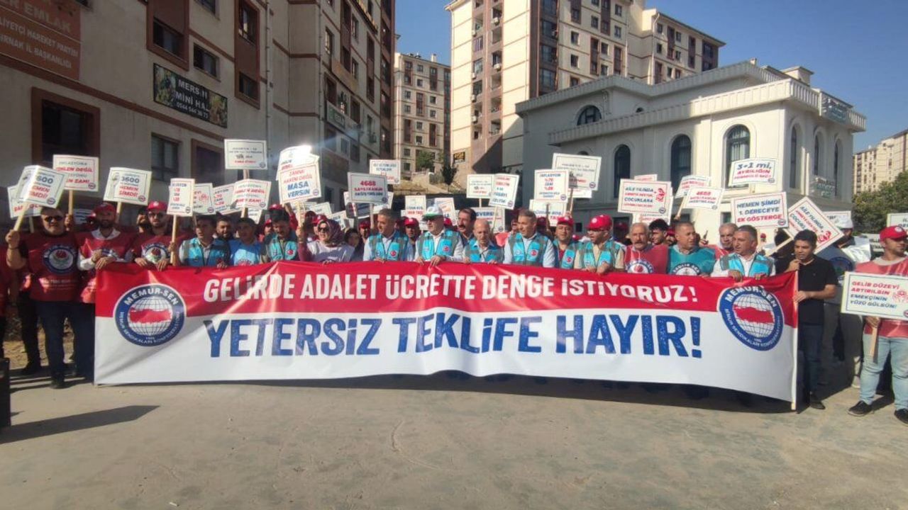 Şırnak’ta da Memur-Sen üyeleri, sendika binasının arkasındaki boş arazide toplandı. Ellerinde döviz ve pankartlarla “Haklarımızı istiyoruz” sloganları atan grup, hükümetin teklifine tepkilerini gösterdi. Şube Başkanı Abdullah Çatı, memur ve emeklilerin kaybedecek zamanı olmadığını belirterek, “Türkiye büyürken alım gücümüz de artsın. Toplu Sözleşme Masası, eşitliği ve dengeyi sağlamalı” dedi. Çatı, mantıklı bir teklif sunulmazsa Şırnak’ta daha geniş katılımlı etkinlikler düzenleyeceklerini de sözlerine ekledi.