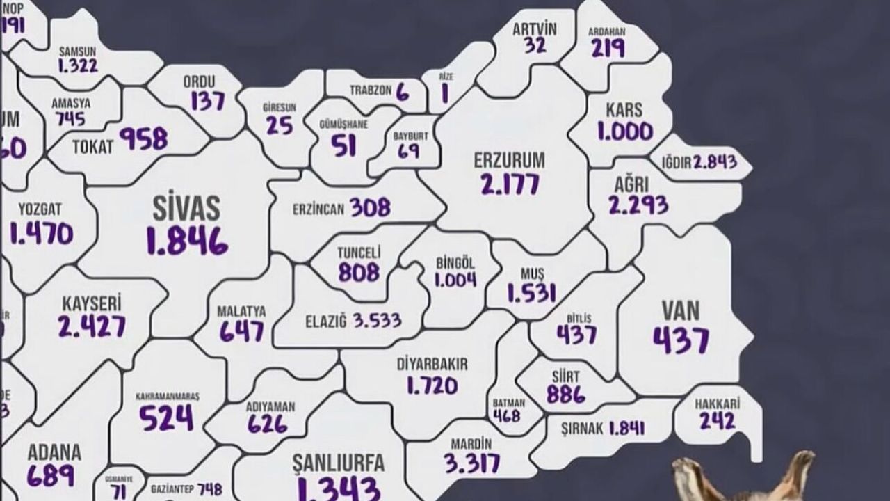 Türkiye’de en çok eşek bulunan iller sırasıyla Konya (6.238), Aydın (5.293), Mardin (4.585), Erzurum (4.431), Tokat (4.337), Afyonkarahisar (4.199) ve Kütahya (3.860) olarak kaydedildi. Veriler, eşek sayısında genel bir düşüş yaşandığını gösteriyor.