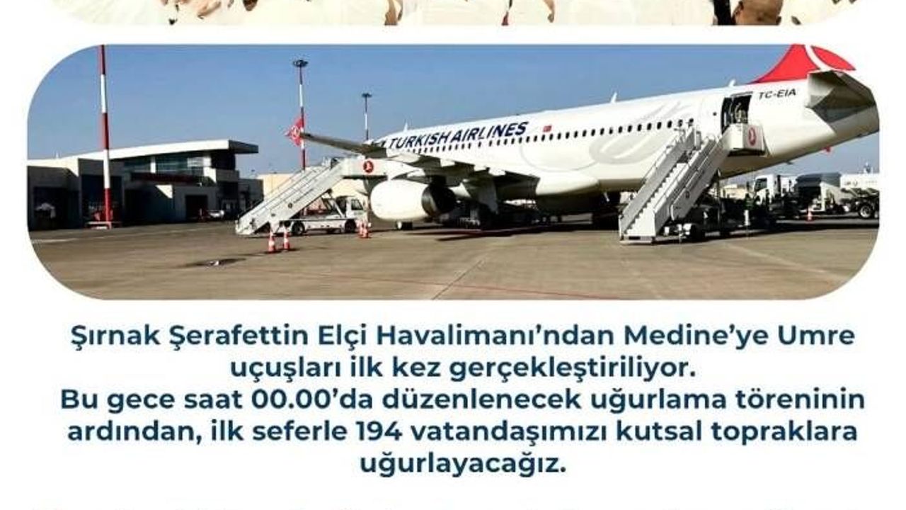 “Şırnak Şerafettin Elçi Havalimanı’ndan Medine’ye umre uçuşları ilk kez gerçekleştiriliyor. Bu gece saat 00.00’da düzenlenecek uğurlama töreninin ardından 194 vatandaşımızı kutsal topraklara uğurlayacağız. Umre yolculuğuna çıkacak vatandaşlarımıza hayırlı, huzurlu ve bereketli bir ibadet diliyorum. Rabbim yapılan ibadetleri kabul eylesin.”