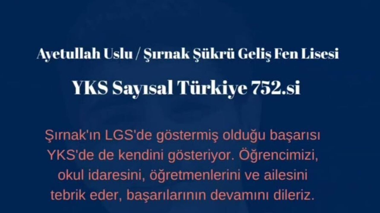 Bu yılki YKS’de Şükrü Geliş Fen Lisesi öğrencisi Ayetullah Uslu, sayısal puan türünde Türkiye genelinde 752’nci olarak önemli bir başarıya imza attı.