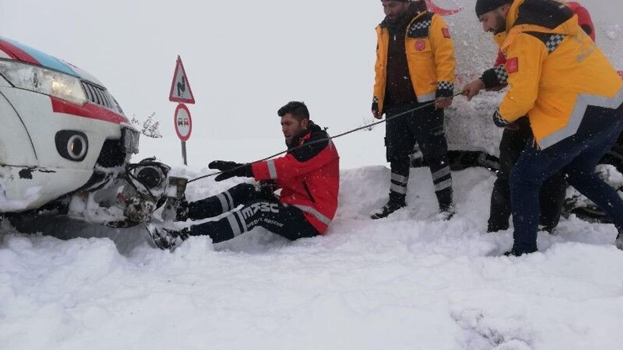Şırnak AJANS- Şırnak merkeze bağlı Yeniaslanbaşar köyünde hasta almaya giden paletli ambulans kara saplandı. Karı elleri ile kazarak aracı bulunduğu yerden kurtaran sağlık ekipleri, hastayı hastaneye yetiştirdi.
